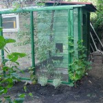 Een kippenhok met ren aan een bestaande schuur gebouwd.